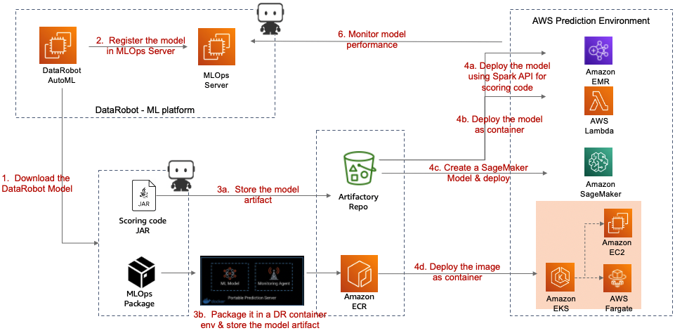 The DataRobot AutoML platform orchestrates the complete model development and training lifecycle, including auto feature engineering, auto model selection, and model ranking based on target metrics. Meanwhile, AWS has created a suite of compute capabilities that provide the ability to deploy ML models quickly.