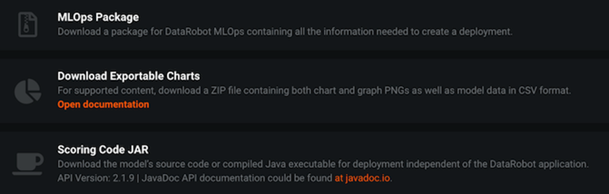 - Download the DataRobot model as a compiled Java executable. This dependency-free JAR file is now independent of the DataRobot application. Scoring Code JAR pre-packages the MLOps monitoring agent for model monitoring.