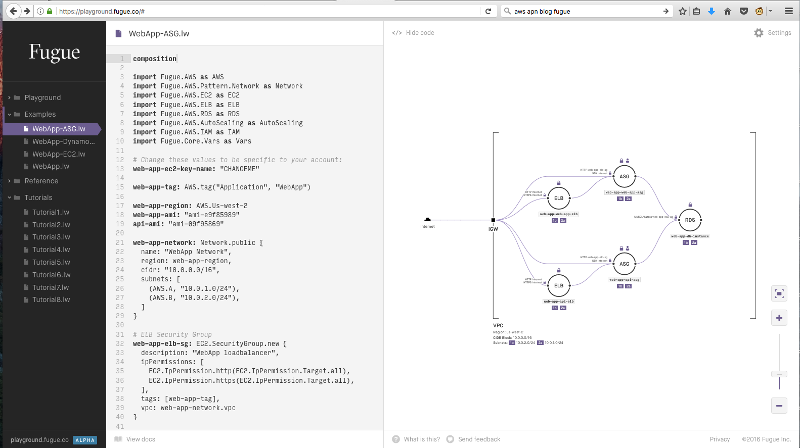 Fugue’s visualization tool is presented in three panes. The left pane column shows your file structure with sample Fugue compositions that will create your AWS infrastructure. The middle pane displays the composition that is being visualized, and the right pane provides the illustration. Customers can view their AWS infrastructure before creating or changing any resources.