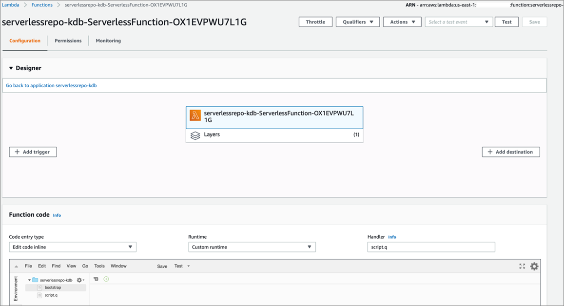 Figure 2 – AWS Lambda console with q/kdb+ custom runtime.