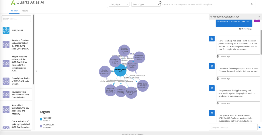 When it comes to accessibility, Atlas AI features a chatbot as indicated in Figure 5 simulates a research assistant, enabling researchers to query the knowledge graph conversationally. This removes the need to learn any specialized querying commands. The combination of the query builder and the chatbot empowers users to harness the full power of the knowledge graph to execute complicated queries and answer complex research questions without needing IT or software engineering help.