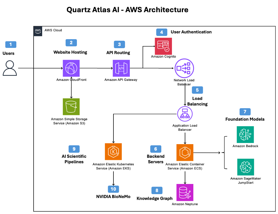 As a response to assist with these challenges, Quartz Atlas AI™ for drug discovery was created. This innovative, AI-powered workbench is designed to revolutionize pharmaceutical research and discovery. Atlas AI is hosted on Amazon Web Services, built by Deloitte, and powered by the NVIDIA BioNeMo AI platform for drug discovery. It’s is a tool crafted by scientists for scientists.