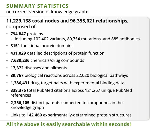- Connects over a dozen open source pharmaceutical datasets, including proteins, chemicals, antibodies, academic literature, and more. Users can access this data in a single query in a matter of seconds, rather than searching through all these disparate datasets over the course of hours.