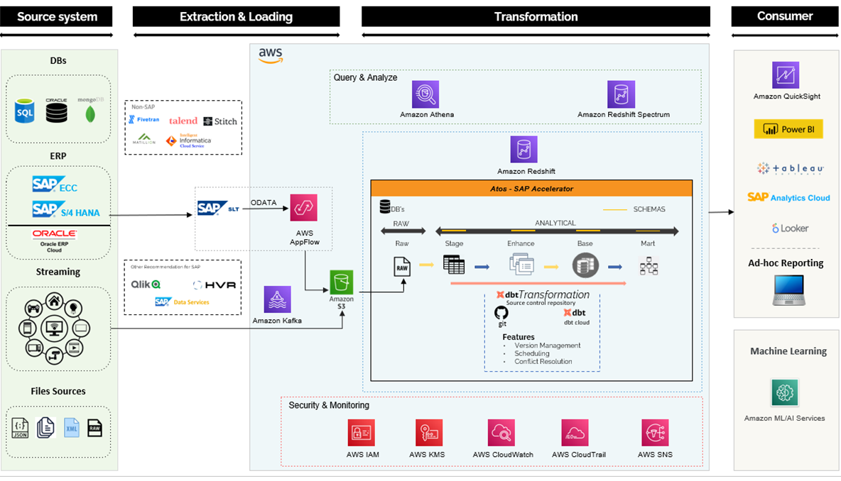 The Atos Data Lake Accelerator for SAP combines years of experience in SAP data warehousing technologies with scalable AWS microservices for ingestion, transformation, and data modelling. This solution accelerates the process of building a Redshift data mart anchored by SAP data, and can be used for advanced analytics and reporting on SAP data, or combined with non-SAP data for even more insights.