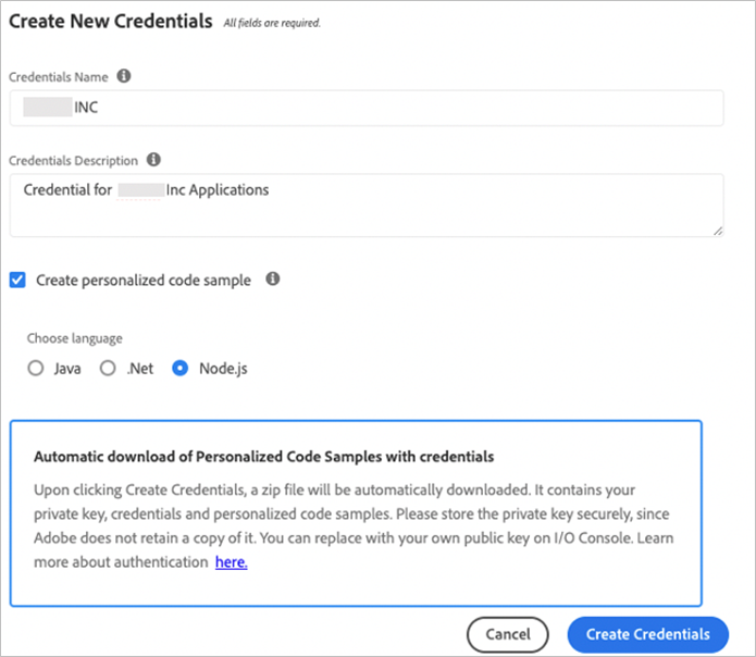 - Enter a name and description for your credentials. Select Create personalized code sample to download a code sample with your credentials. Also check Node.js as programing language for this exercise. Click Create Credentials.