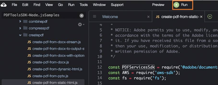 - The sample code is available under the src folder. The Readme section of the project provides many examples to convert files of various formats to PDF. You can also see Adobe SDK documentation sub-sections on to how to run the samples.