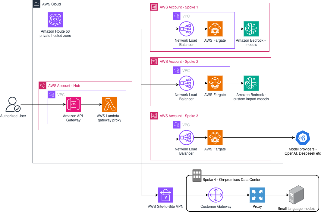 The AI gateway uses a hub-and-spoke architecture. Each hub connects to a specific model provider: Amazon Bedrock, third-party APIs, or on-premises models. All hubs share a single entry point and DNS routing mechanism.