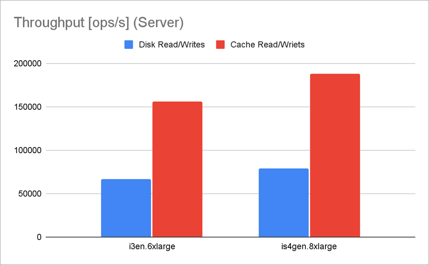 The graph above shows operations per second (OPS) throughput results on i4i.16xlarge vs. i3.16xlarge (both with 64 vCPUs) with 50% reads and 50% writes (higher is better).