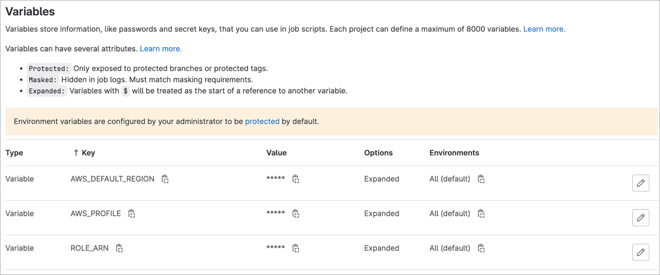 - CI/CD variables: The project variables include the role Amazon Resource Name (ARN) to access AWS. The role ARN is passed into the web identity federation file.