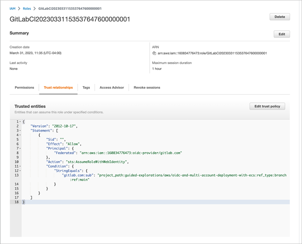 Figure 3 – The role attached to the IdP defines permissions between AWS and the ECS deployment project in GitLab.