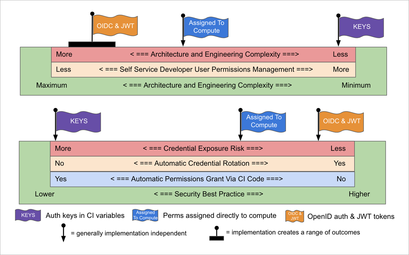 In Figure 5 below, you can see a visual trade-off optimization blueprint that can be used for optimizing the trade-offs and meta trade-offs (green scales) of the various implementation options for Runner authorization into AWS environments.