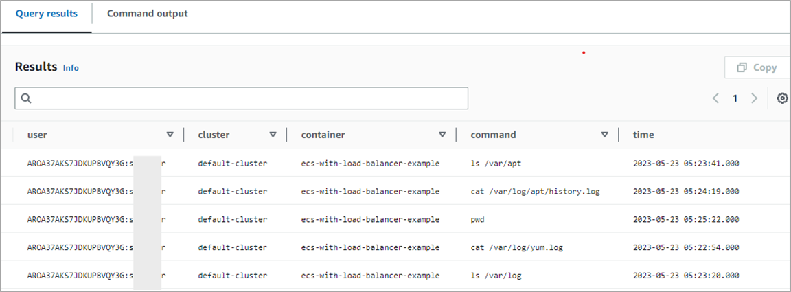 As shown next in Figure 2, the command output provides details of who executed what command in the cluster, along with execution time and container details.