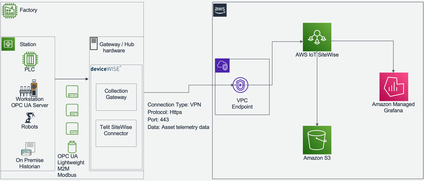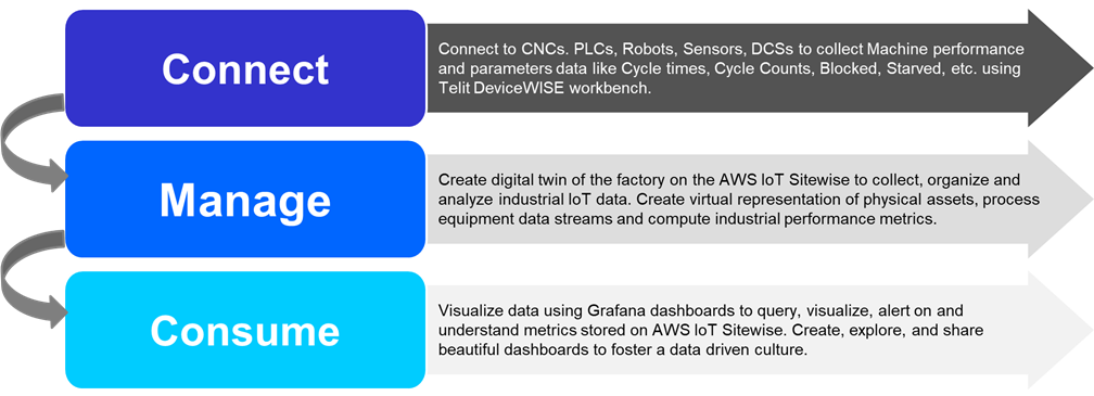 - Connect: Connect to Computer Numerical Controls (CNC), Programmable Logic Controllers (PLCs), robots, sensors, Distributed Control Systems (DCSs) to collect machine performance and parameters data like cycle times, cycle counts, blocked, and starved machines using Telit DeviceWISE workbench.