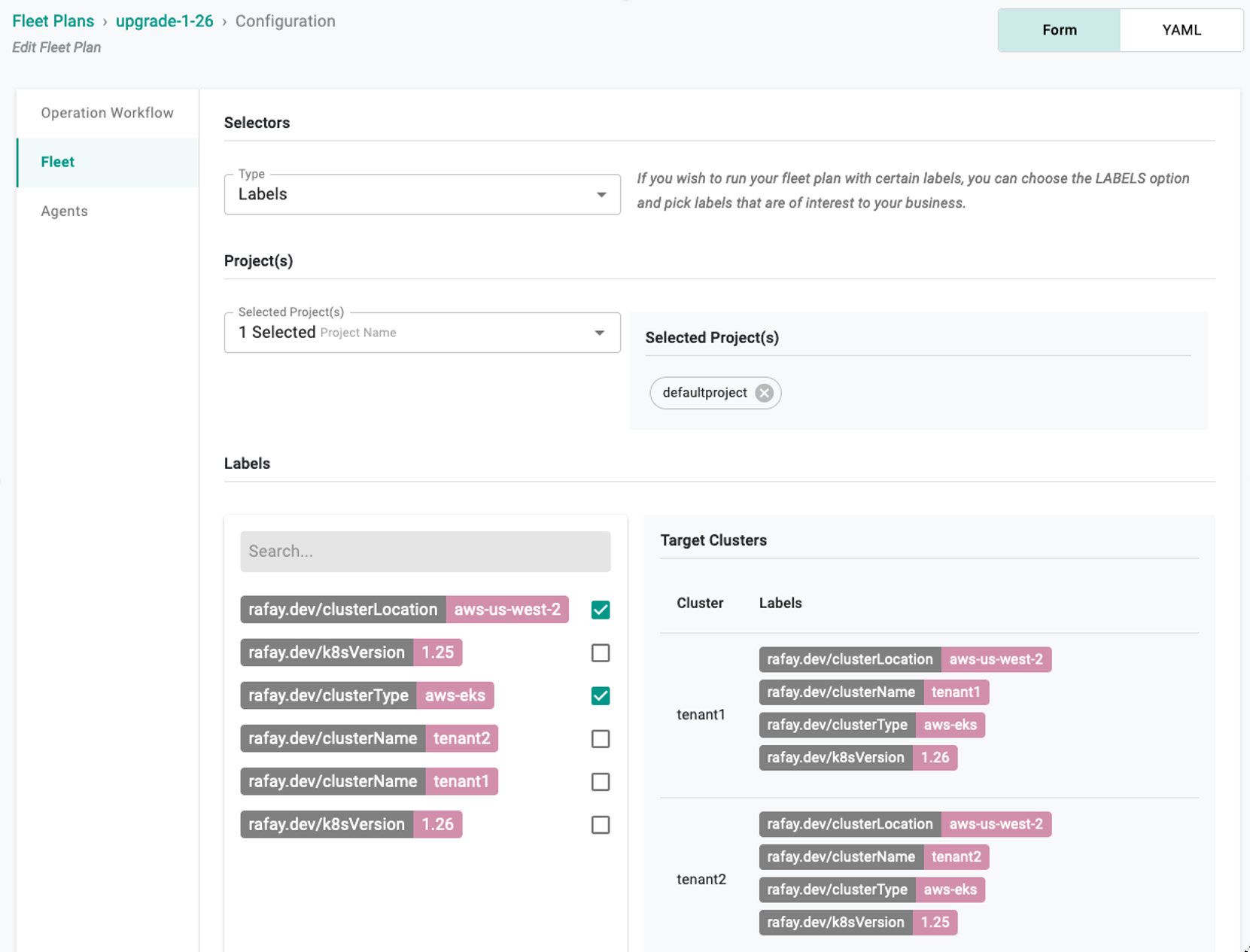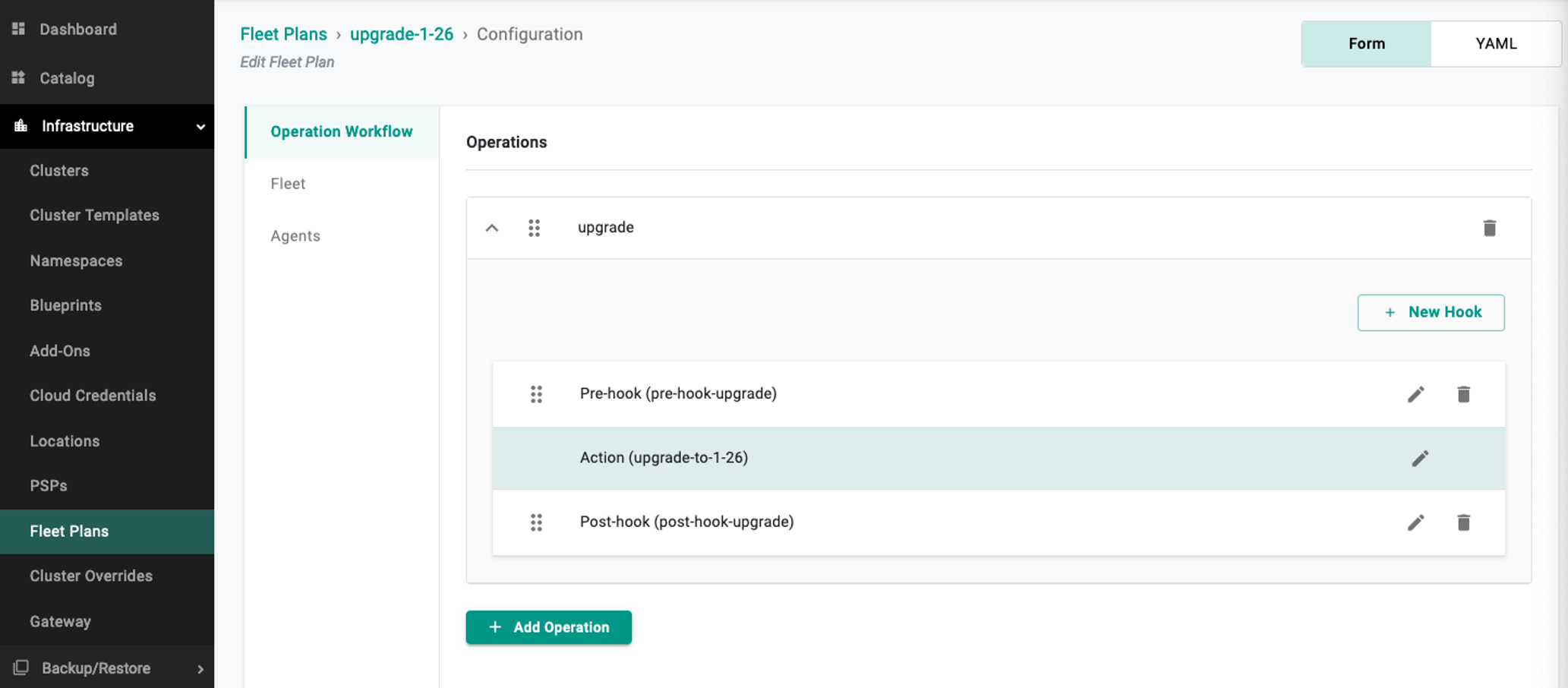 Next, we navigate to the Fleet Plans to create a new plan. We can use a declarative YAML configuration or the form user interface (UI) to set up the plan. You can set up multiple operations within a single Fleet Plan; for example, to upgrade the control plane and node groups separately.