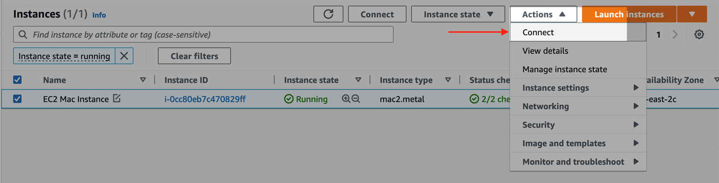 Figure 1 – Where to find the “Connect” button in Mac EC2 instances.