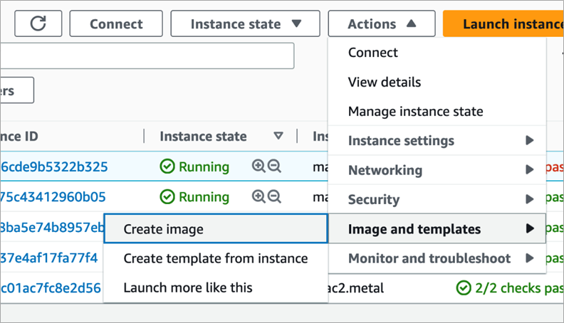 Once all of the required profiles appear on the list, create an image of the instance. Creating an image of an EC2 Mac instance allows you to launch new instances.