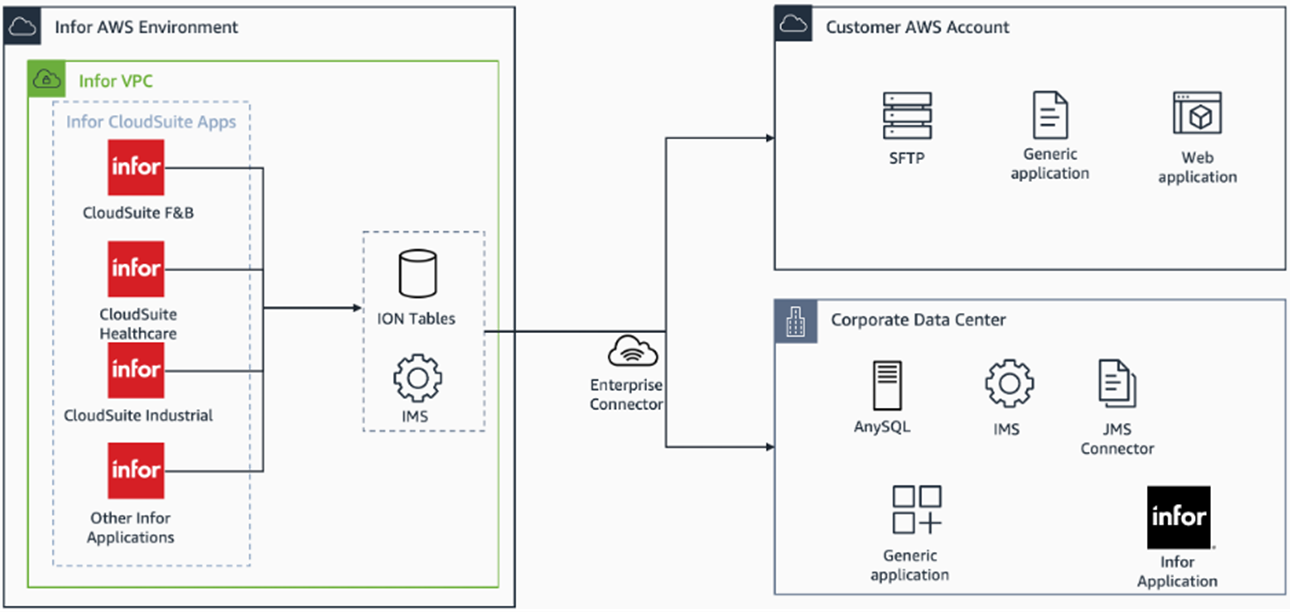 You can use the Infor Enterprise Connector to provide hybrid service integration for Infor Cloud services and your local deployed services. Enterprise Connector provides an out-of-the-box connectivity with Infor Cloud through Amazon Simple Queue Service (SQS) and Amazon Simple Storage Service (Amazon S3) used for intermediate storage.