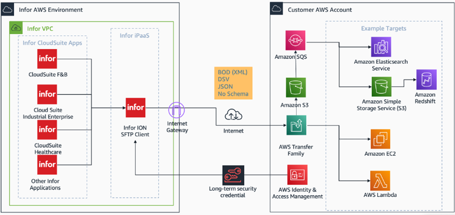 Another way to integrate applications with Infor CloudSuite is through bulk data transfer over Secure Shell (SSH) File Transfer Protocol (SFTP). Infor ION acts as an SFTP client and polls an SFTP server for new data. AWS makes it simple to provision an SFTP server using AWS Transfer Family.