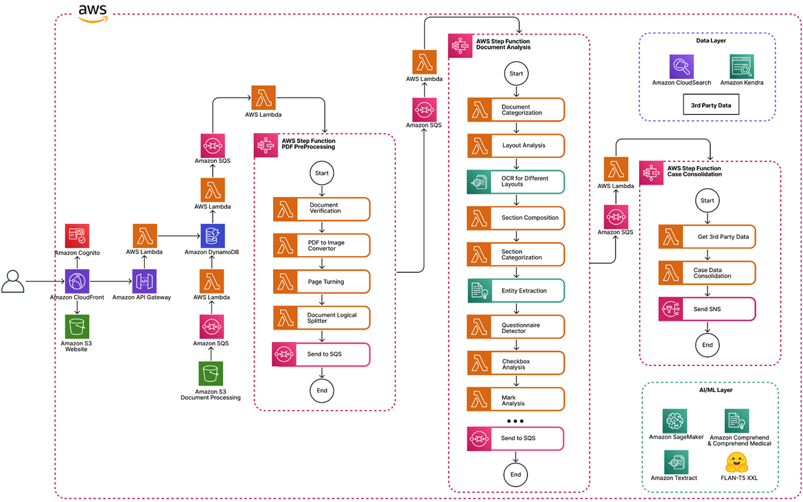 The web app provides insurance and healthcare providers with a user-friendly interface, hosted on Amazon Simple Storage Service (Amazon S3) and served by Amazon CloudFront for fast and reliable access. User authentication is managed by Amazon Cognito, while the backend utilizes Amazon API Gateway, AWS Lambda, and Amazon DynamoDB for secure data storage and management.