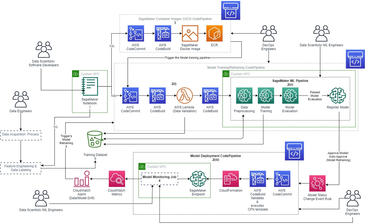 - Model training/retraining pipeline implemented using Amazon SageMaker Pipelines (pipeline-as-code) and executed using CodeBuild.