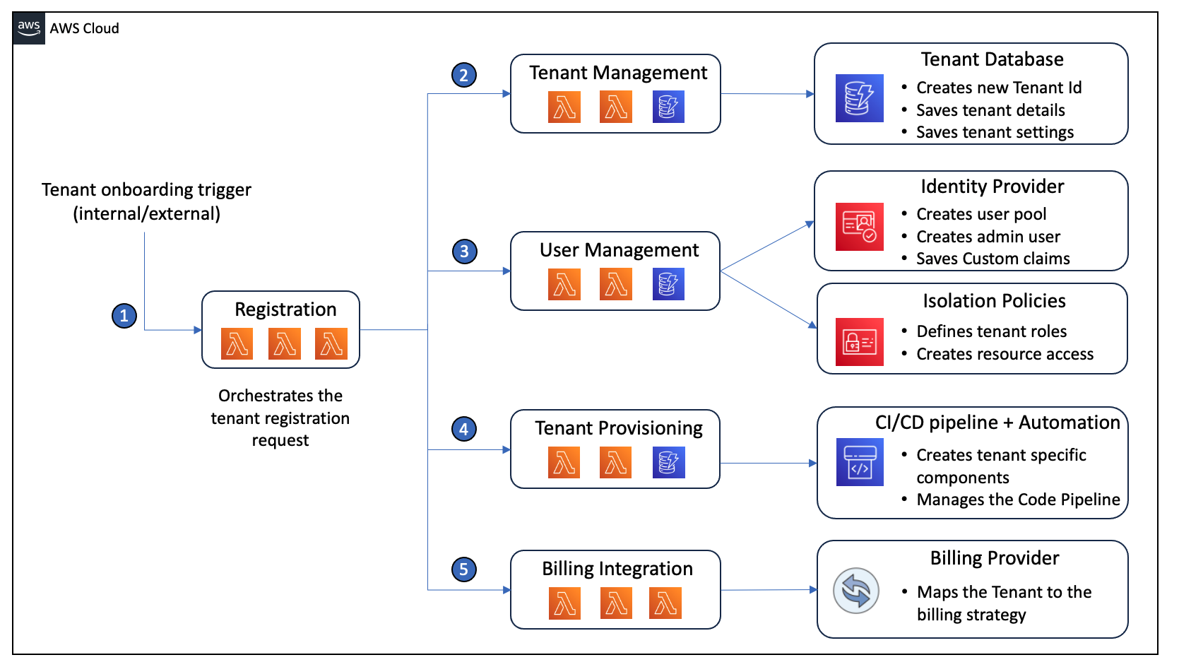 There is always a series of steps involved in the tenant onboarding flow which need to be properly orchestrated and implemented as a part of the core service in the SaaS control plane to provide the seamless and unified experience to the end user. Based on the type of the SaaS use case, and the technology stack you are using, you can plan the right mechanism to fully automate those steps utilizing best practices.