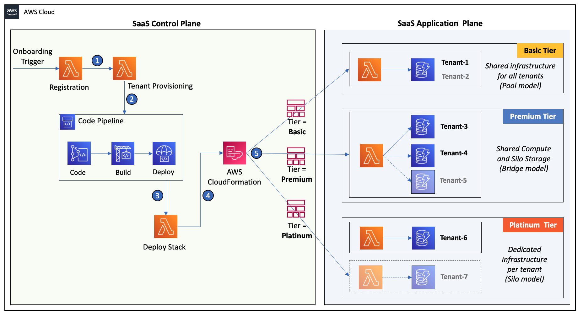 - Based on the tier details of the tenant, the CloudFormation stack deploys the appropriate infrastructure resources needed to host the new tenant, facilitating the dynamic deployment strategy.