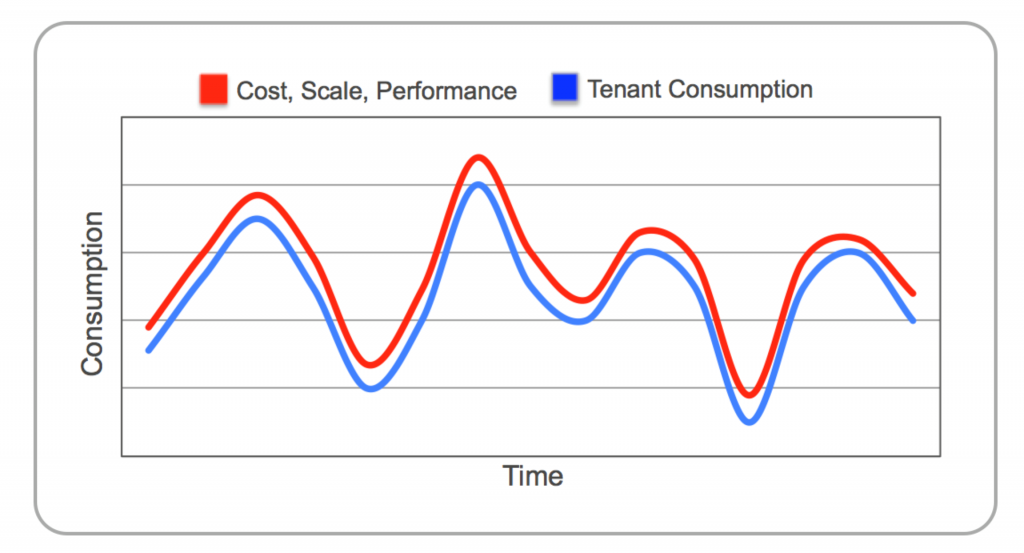 The following diagram represents an idealized representation of how SaaS organizations prefer to model the connection between load and resource consumption. Here, you see actual tenant consumption in blue and the allocated resources in red. In this model, you’ll notice that the application’s resources are allocated and deallocated in lockstep with tenant activity. This is every SaaS architect’s dream. Here, each tenant has a positive experience without over-committing any resources.