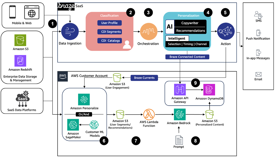 - Data Streaming: Braze Currents streams engagement data to Amazon S3, enabling AI-driven segmentation and recommendations through Amazon Personalize or custom Amazon SageMaker models.