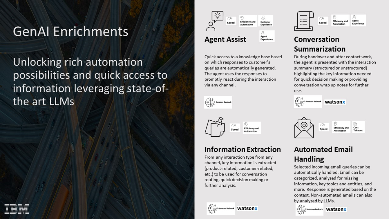 Following the principles above, IBM CCM has implemented four generative AI accelerators using AWS generative AI services: