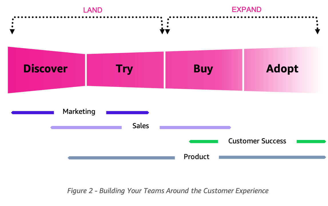 PLG breaks silo organization models and helps teams align to outcomes. It drives new organizational models where various functions are built to serve the motions of Land and Expand. To achieve this, it is key to define the right roles, hire or train the right individuals for those roles, and equip them with the necessary tools and metrics.