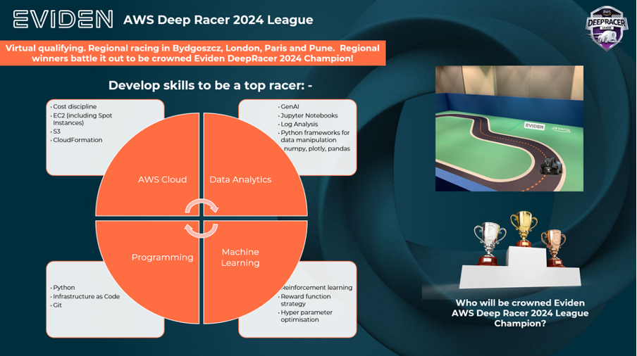 Eviden, a next-generation technology leader in data-driven, trusted, and sustainable digital transformation, is proud to share its journey with the AWS DeepRacer platform. As an AWS Premier Partner, Eviden leverages the power of Amazon Web Services (AWS) to drive innovation and empower its global team of 47,000 world-class talents. In this post, we’ll explore how Eviden harnessed the AWS DeepRacer platform to accelerate its employees’ AI/ML learning and development, fostering a culture of continuous improvement and community engagement.