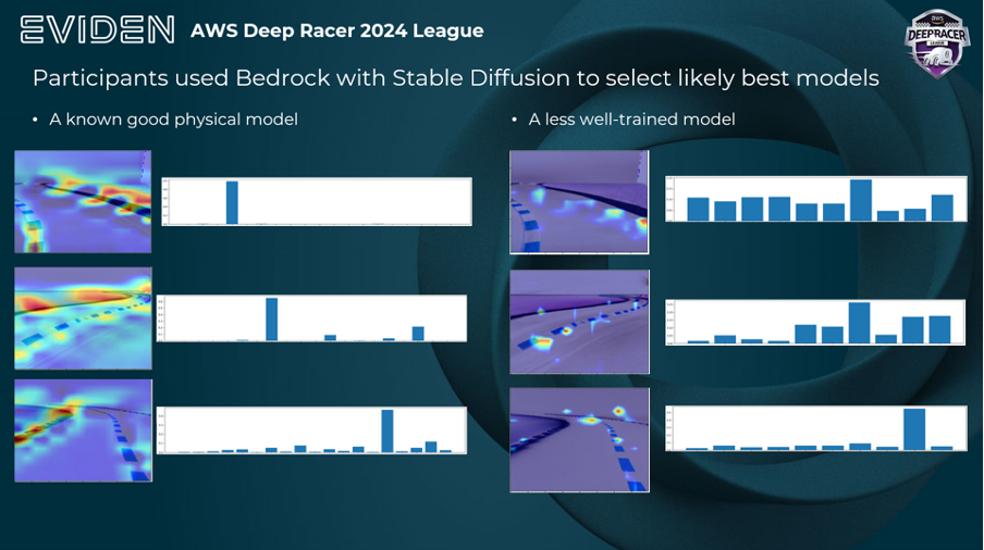 Given that racers had no access to test their models in the real-world before physical racing, evaluating whether their models were well-generalized posed a significant challenge. To address this, Eviden leveraged Stable Diffusion, to generate new images from the original training data that the models had never encountered before. Analysis could be performed to see what features of the images the model was using to make decisions, as well as the probability distribution of which action (combination of speed and steering angle) the model would take based on a given image. This informed the racer on the likelihood of the model being well generalized and likely to perform in the physical race, rather than being overfit to the training data and unlikely to perform well in the physical race. In the image below, on the left, the well-generalized model effectively identifies and focuses on relevant track features, exhibiting a confident and concentrated probability distribution of actions tailored to the presented scenario. In contrast, the image on the right depicts a poorly generalized model that struggles to identify meaningful features and exhibits a wide distribution of actions it may take.