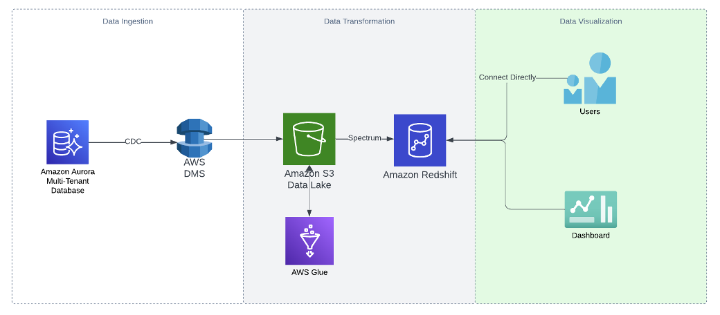 - Data Warehouse: Create a local Redshift table from the glue catalog table, setting Redshift distribution preferences and implementing Row-Level Security (RLS) for tenant data segregation.