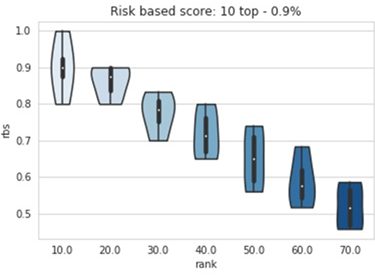 Figure 2 below shows an example of risk-based sampling on a small subset of 70 calls selected at random. The baseline incidence of the outcome of interest is around 50 percent, as highlighted by the median risk-based sampling when rank=70 (referring to the whole random sample).