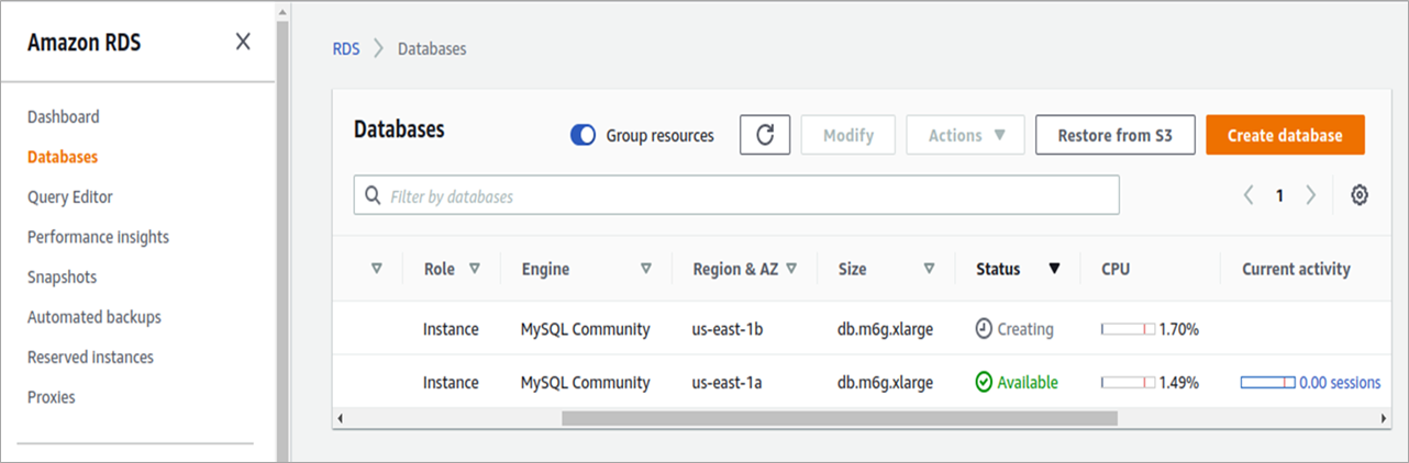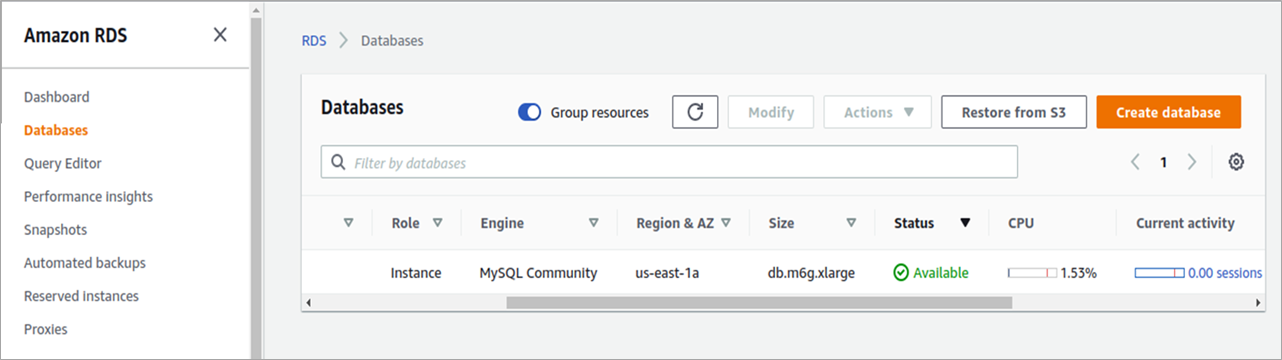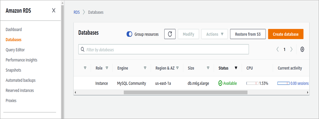 We have already deployed a MySQL instance with 16GB RAM and 100 GB storage on AWS to run an application. As you can see in the screenshot below, the console shows the resource status available.