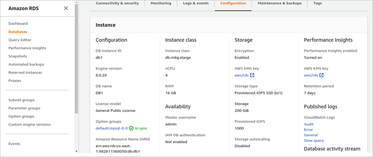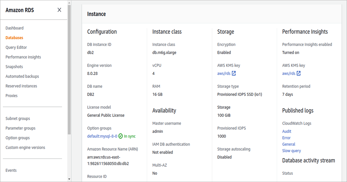 To verify the specifications of your deployed instance, just click on the instance link. The console will redirect you to the instance’s overview which includes configuration, instance class, storage, performance insights, multi-Availability Zone, and other options.