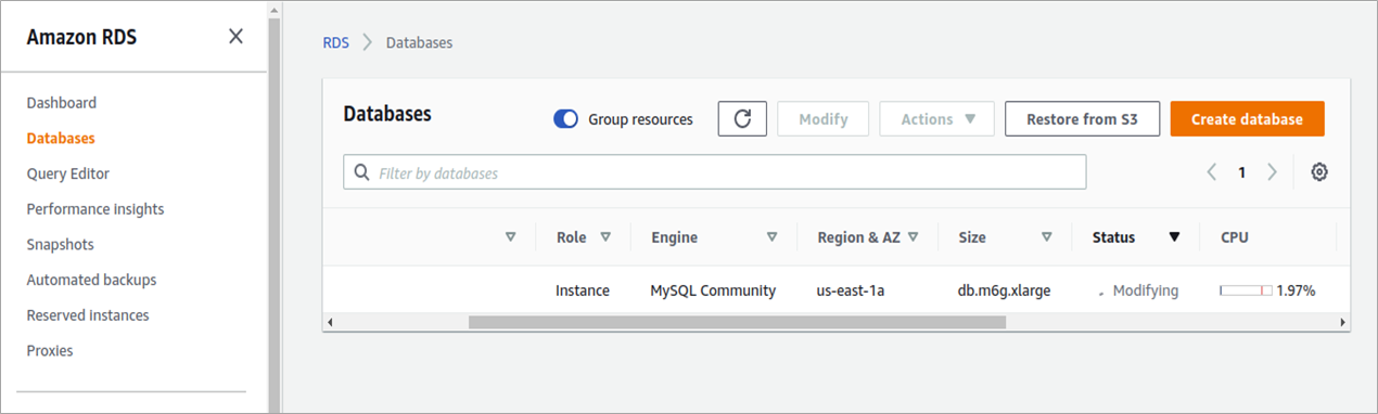 Once the mentioned RDS template with new configuration requirements is pushed, you can see a change in the status of RDS service as “Modifying” in the console.
