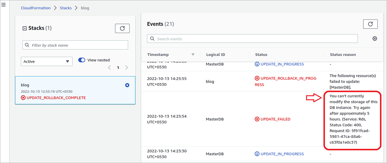 However, we successfully updated our RDS service’s storage value without experiencing downtime. We also received a message in our console as “Error” that there is a five-hour wait time when we can change the storage value again. Pay attention to details when attempting to create a solution for your project.