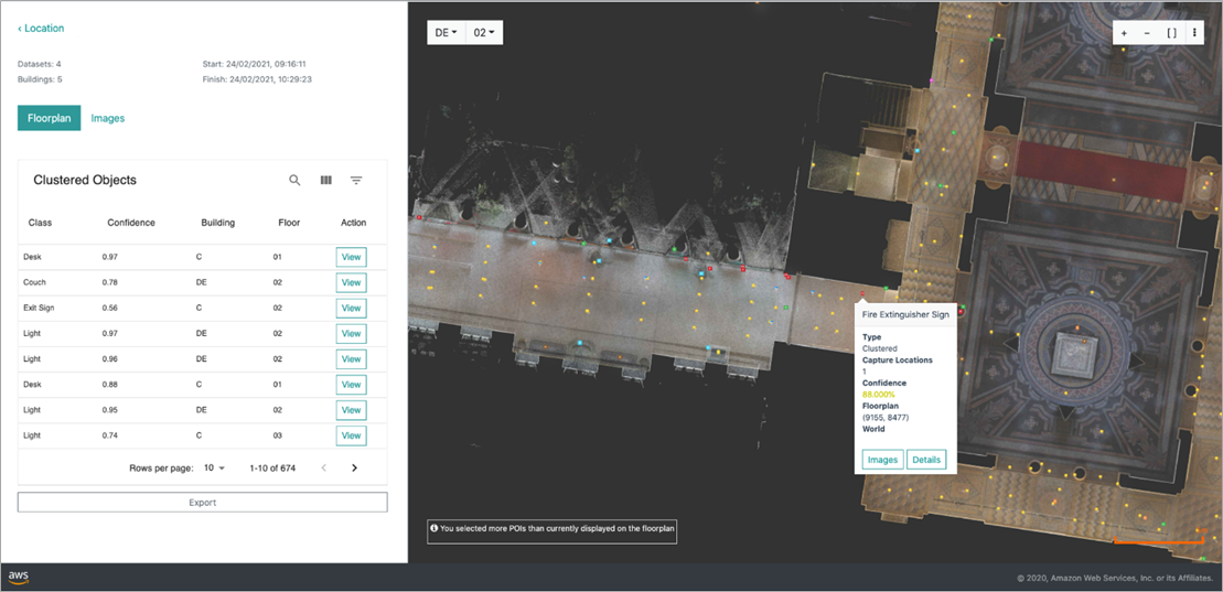 The digital twins presented here use accurate 3D point cloud data and panoramic images provided by the NavVis Reality Capture Solution. To further populate the digital twins with object-level information, AWS Professional Services automated the object detection in the cloud.