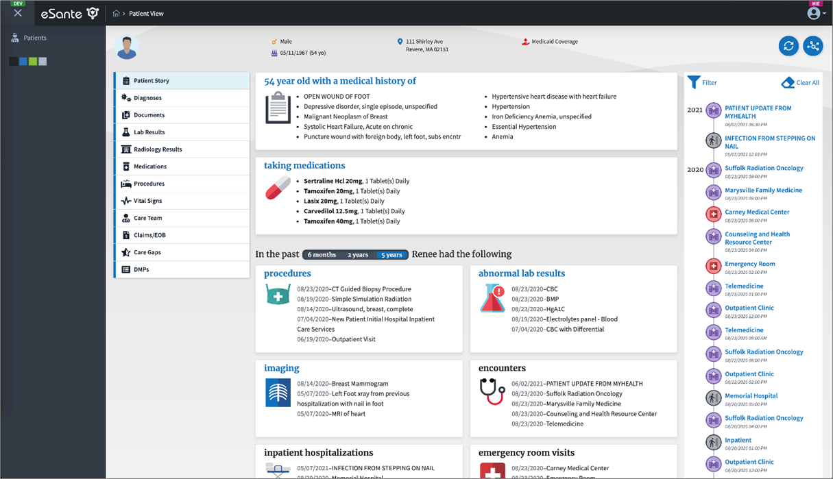 For example, users can search for a patient and view a summary of all salient clinical information related to them in a patient story screen.