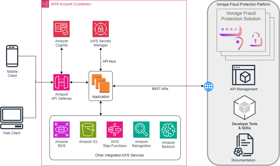 Figure 1: Integrating Vonage APIs and additional security features with AWS