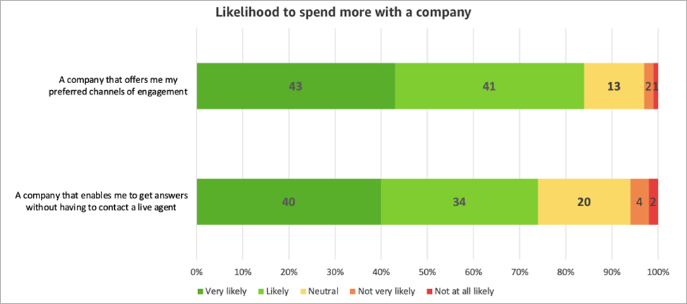 This is what consumers want; 84% of respondents are more likely to spend more with brands that allow them to choose their preferred channel. Meanwhile, 74% of respondents are more likely to spend more with brands that allow them to avoid contacting a live agent.