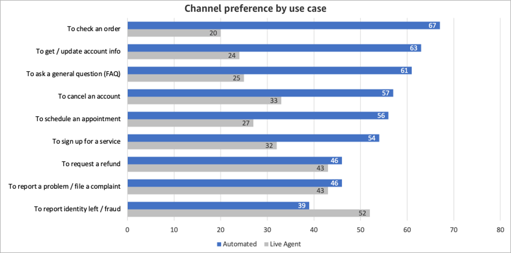 Even for less traditional customer service use cases, like signing up for an account or booking an appointment, automated solutions were more strongly preferred over live agents—2.1 times and 1.7 times, respectively.
