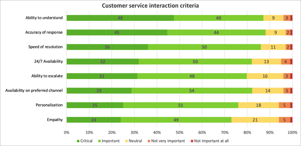 When it comes to customer service interactions, respondents care most about the ability to understand their issue and respond accurately, regardless of automated solution or live agent. Based on the survey, 89% feel the accuracy of the response is important, and 88% feel the ability to understand is important.