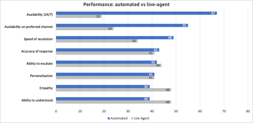 As mentioned earlier, availability and speed of resolution are important criteria in customer service interactions. Automated solutions outperform live agents significantly when it comes to 24/7 availability, availability on a preferred channel, and speed of resolution at 3.5 times, 2.3 times, and 1.4 times, respectively.