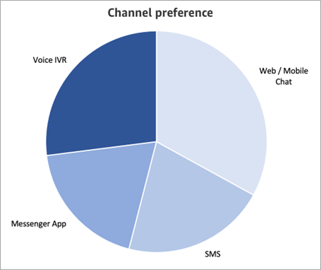 Based on the survey, 73% of respondents prefer text-based channels over voice IVR. Diving deeper, 33% prefer web or mobile chatbots, 21% prefer SMS chatbots, and 19% prefer messenger app chatbots like Facebook Messenger or WhatsApp, for example. This information may be helpful in deciding which channel to automate first.