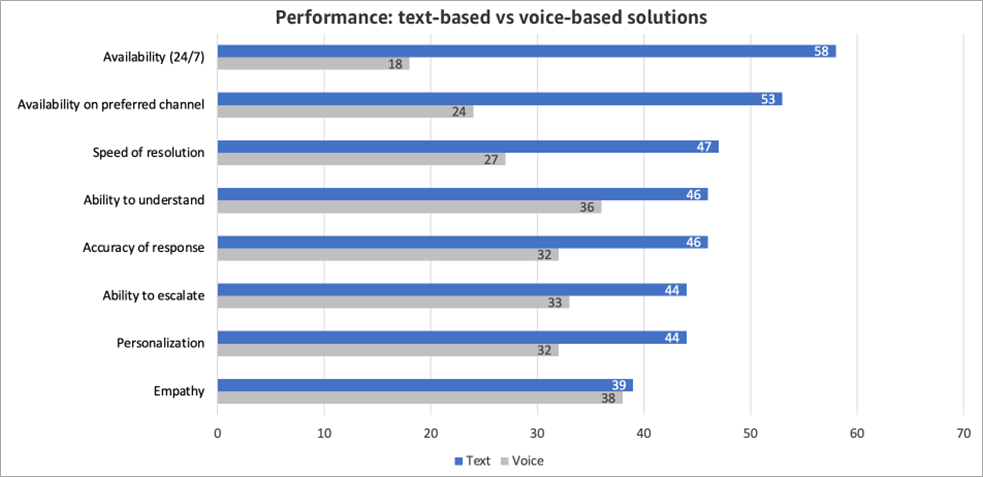 When it comes to the criteria important to respondents, text-based chatbots outperform voice-based IVR across the board. The strongest performance differences are in 24/7 availability, availability on preferred channels, and the speed of resolution at 3.2 times, 2.2 times, and 1.7 times, respectively.