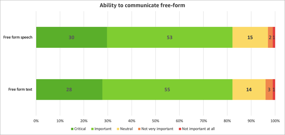 When it comes to automated solutions, enabling customers to speak or write in free-form is key. From the survey, 83% of respondents felt it was important to be able to speak freely in a voice-based solution or write freely in a text-based solution.
