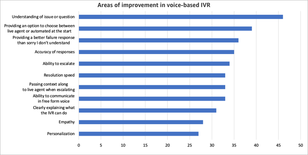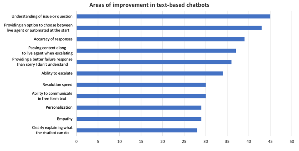 Another area of improvement that stood out is providing the ability for customers to choose between an automated solution or live agent at the start. For text-based solutions, 43% felt this was an area of improvement. For voice-based solutions, 39% felt it was an area to improve.