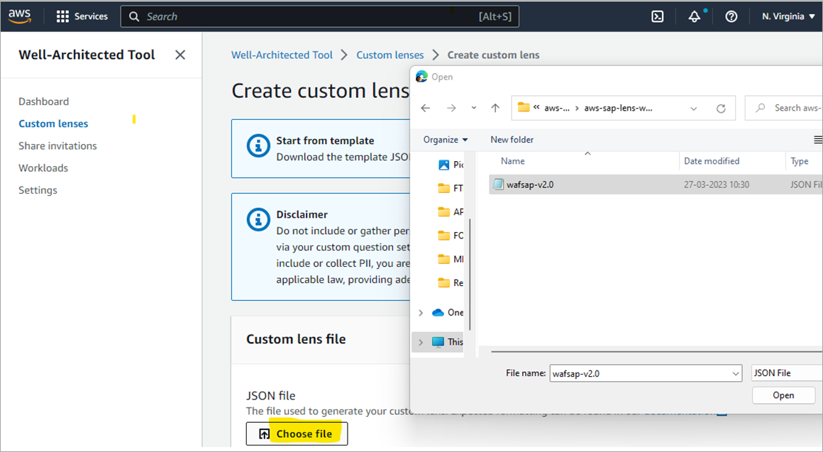Go to the AWS console >AWS Well-Architected Tool > Custom Lens > Create Custom Lens. Then, select the JSON file you downloaded earlier and click Submit.